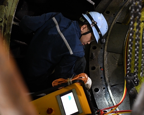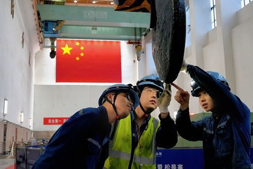 清江公司檢修公司青年員工在隔河巖4號(hào)機(jī)組A修現(xiàn)場(chǎng)(胡中 攝)