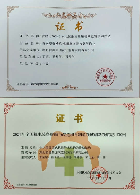 本網訊(丁娜)近日,漢江能源公司制作的《白水峪電站4號機組出口開關倒閘操作》短視頻榮獲中國電力技術市場協會運維檢修分會首屆水電運維檢修短視頻競賽一等獎,《中小型水輪發電機組的傳動機構》案例被評為2024年全國機電裝備維修與改造和再制造領域創新領航應用案例。